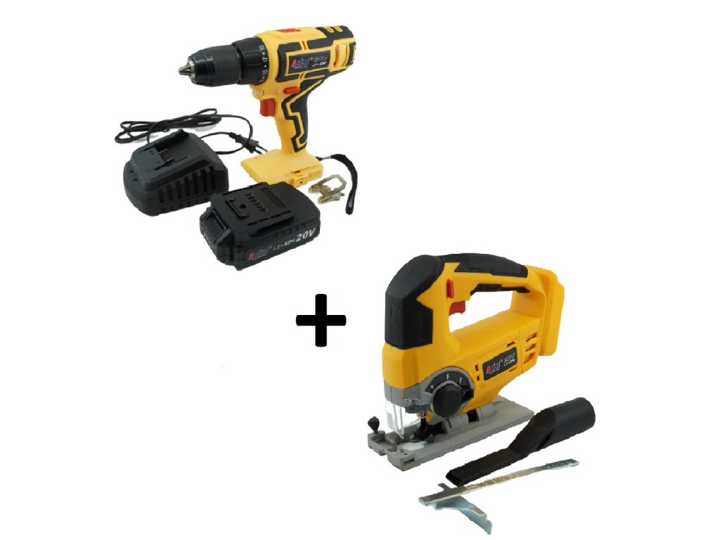 AKU GANG! Sada 2v1: Aku vrtačka 20V 2,0Ah v kufru AE2V20A-201-BMC + přímočará pila 20V AE5PD20A