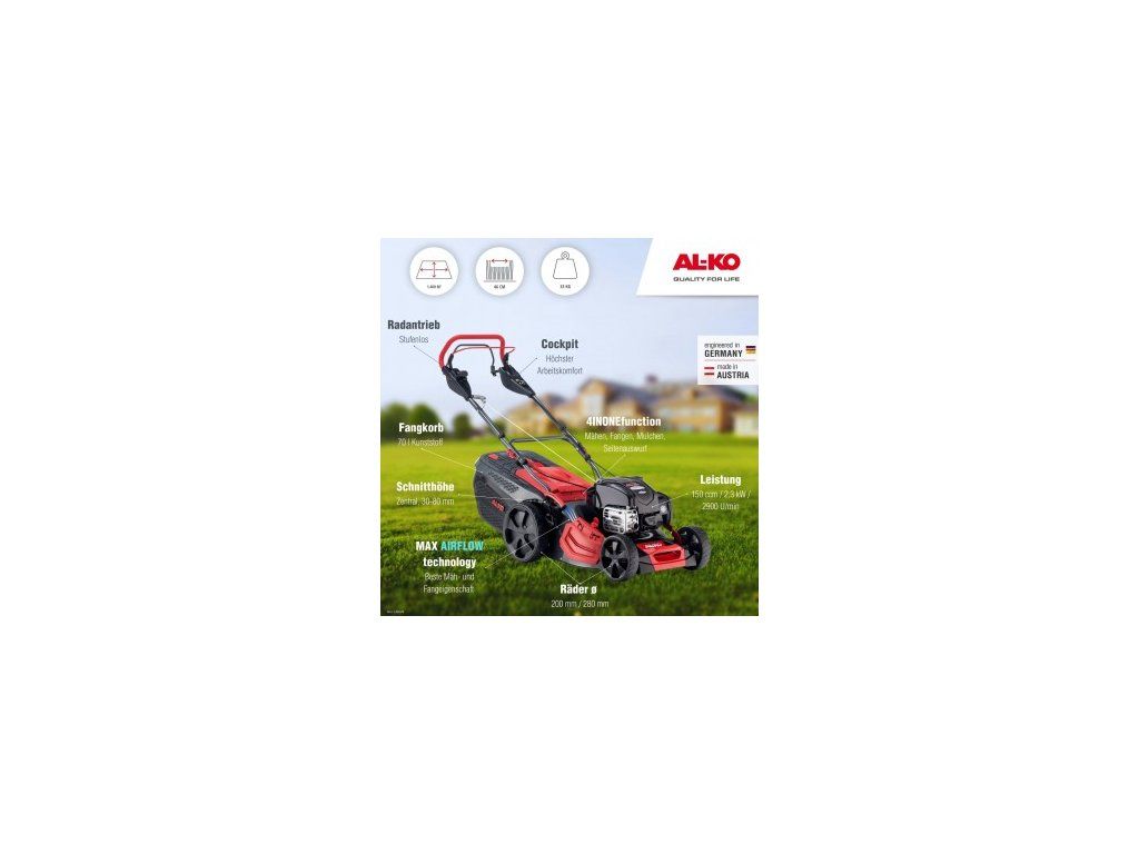- VÝKON MOTORU: AL-KO v parametrech svých sekaček udává skutečný reálný výkon při sekání a nikoliv maximální, který je měřen v laboratorních podmínkách při maximálních otáčkách. Doporučujeme spíše porovnávat obsah motoru, kde bývá výkon v reálu podobný.