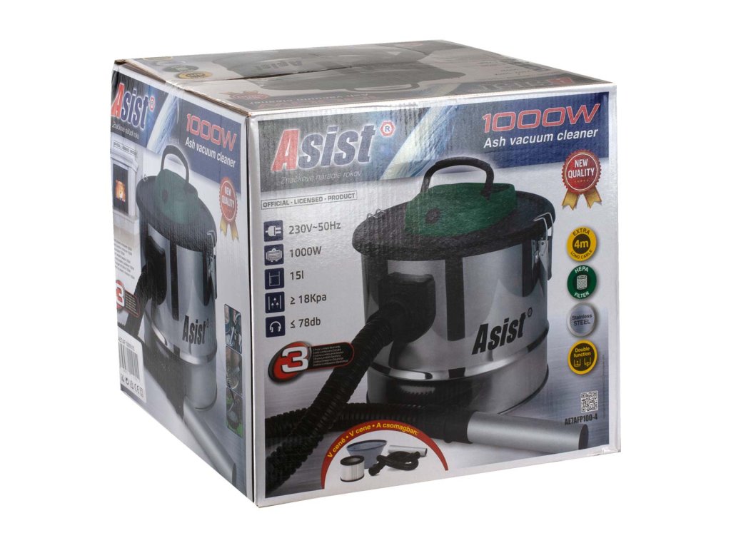 Vysavač popela Asist s nerezovou nádobou o velikosti 15 litrů a příkonem 1000W. Extra dlouhý přívodní kabel. Vysavač má možnost použít dva způsoby filtrace - filtrační vak na prach a HEPA filtr, které lze snadno omýt vodou. Velmi efektivní a elegantní pomocník pro úklid popela z krbů, venkovních grilů, hrubých nečistot nebo úklidu v dílně.