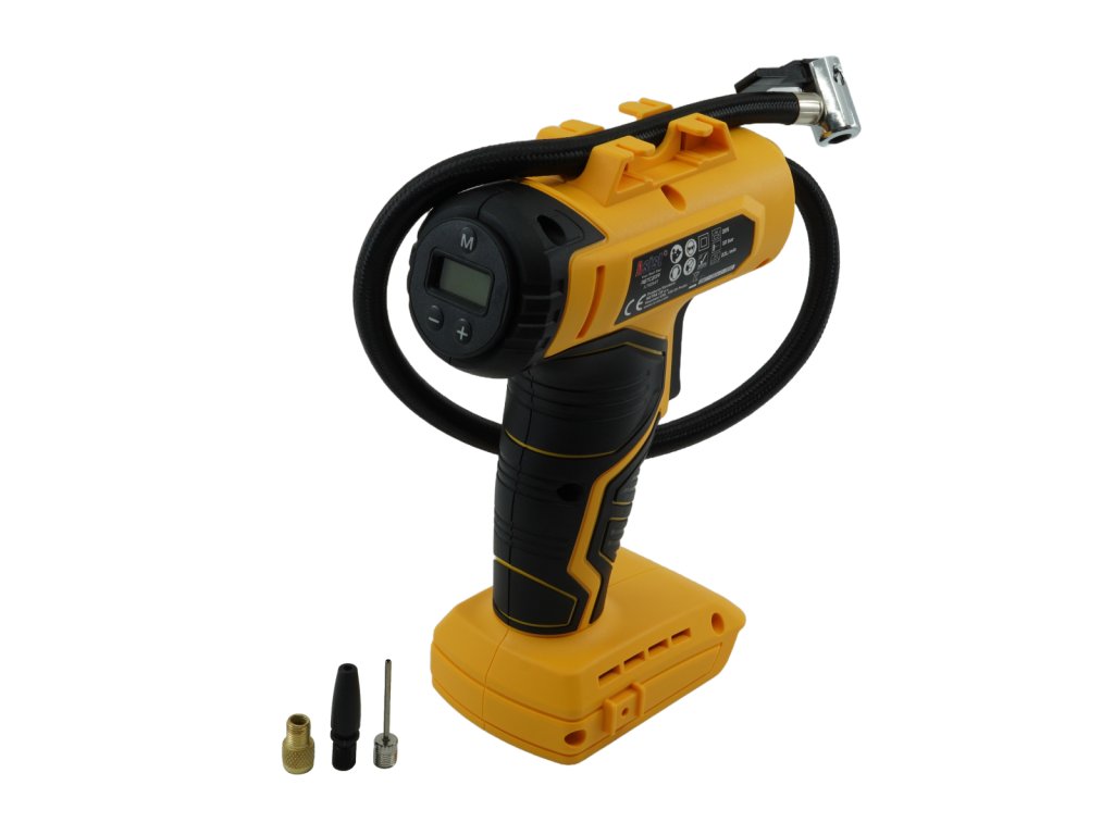 Technické parametry: pracovní napětí 20 V, max. tlak 150 psi / 10 bar / 1000 kPa, průtok 22 l/min, LED osvětlení, Soft Grip, aretace spínače.
