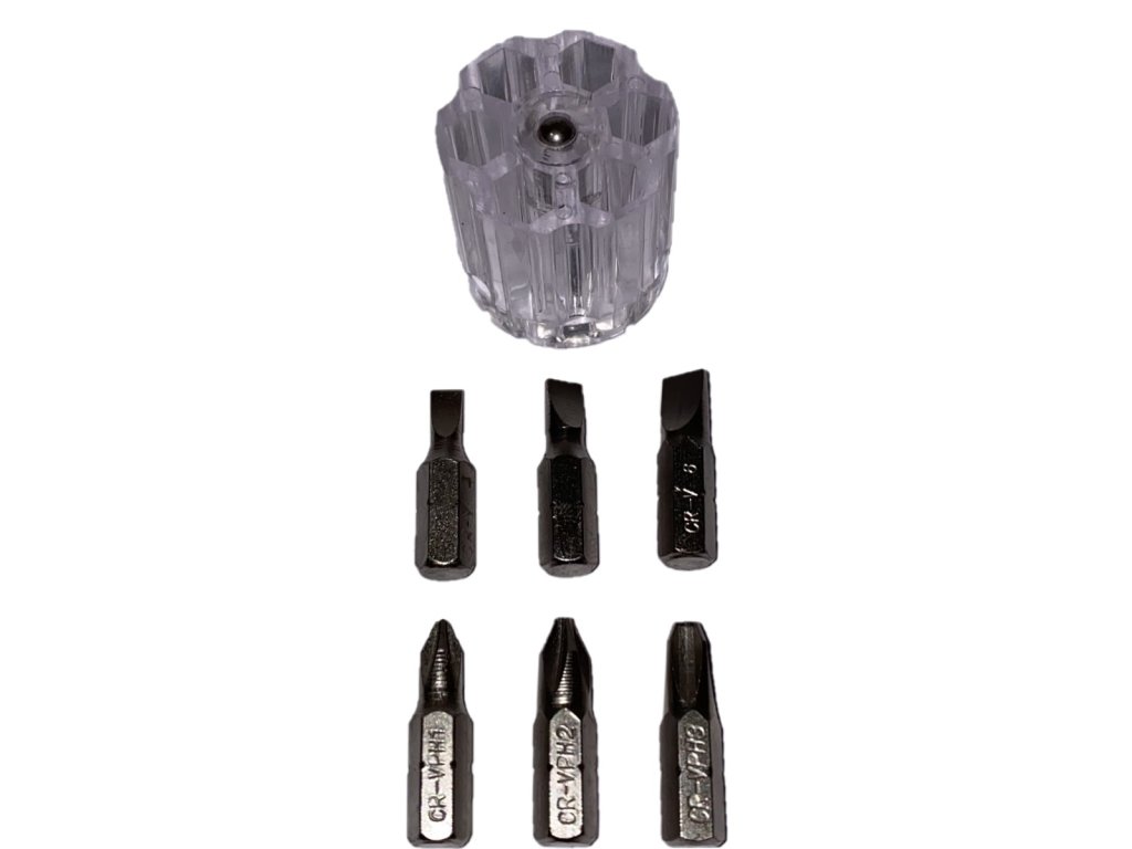 - 6 výměnných bitů (25 mm) z odolné CR-V oceli s pískovou úpravou pro dlouhou životnost a jistý záběr.