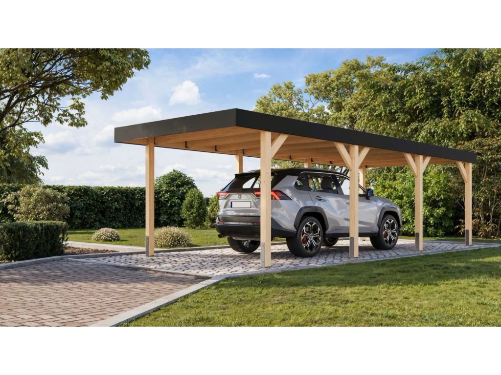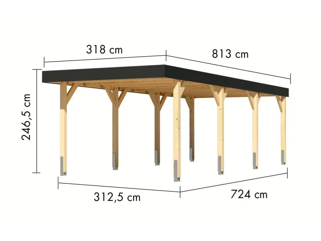 Přístřešek má obdélníkový tvar a svými rozměry vyhovuje většině modelů vozidel běžných na českém trhu. Celková zastřešená plocha je 3,18 x 8,13 m. Díky průjezdné výšce 212 cm je vhodný i pro vyšší automobily a SUV. Střechu podpírá osm robustních sloupků 12 x 12 cm. Celá konstrukce je vyrobena z vysoce kvalitního lepeného smrkového dřeva, které vyniká mimořádnou odolností vůči nepříznivým povětrnostním vlivům. Střešní konstrukce je dimenzována na sněhovou zátěž 140 kg/m2. Vzhledem k velké ploše střechy a zatížení větrem je nutné přístřešek bezpečně ukotvit k zemi pomocí vhodných zemních kotev (nejsou součástí dodávky, lze je dokoupit jako příslušenství).