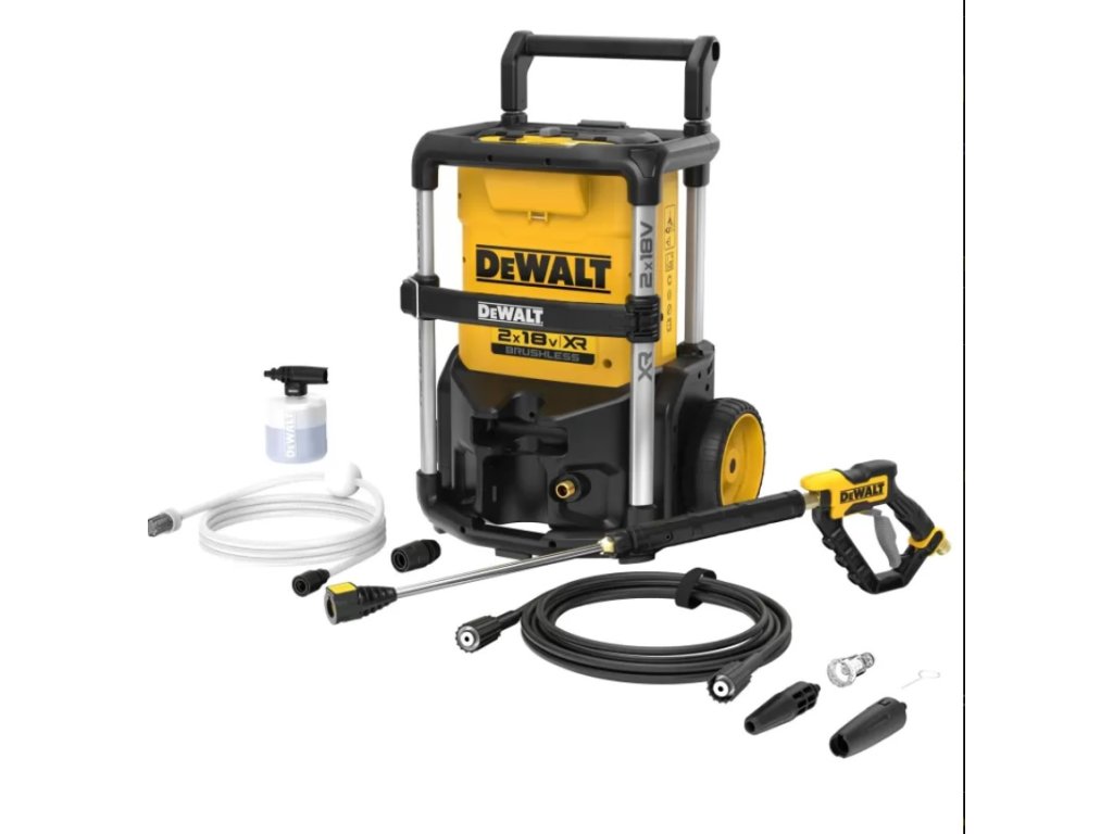 - Napájení zajišťují 2 x 18 V XR baterie, vlastní tlakování znamená, že si myčka umí vzít vodu z kbelíku nebo sudu na dešťovou vodu.