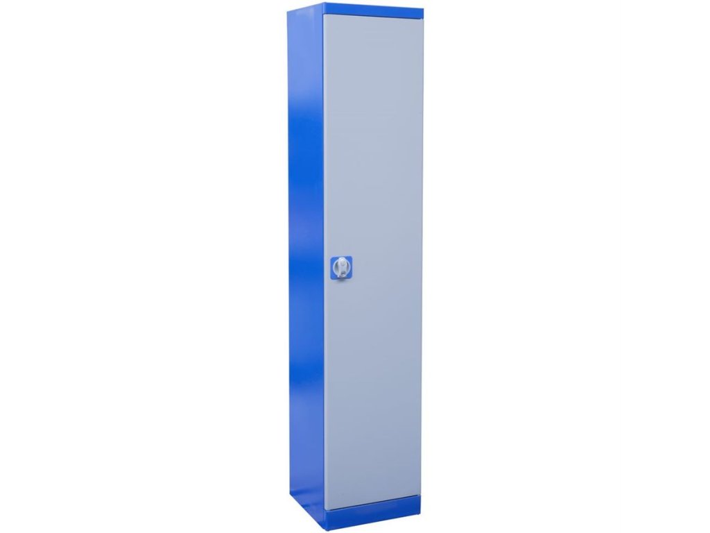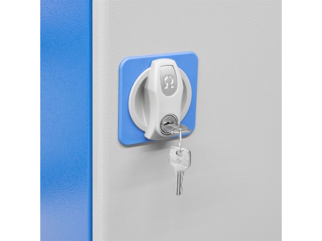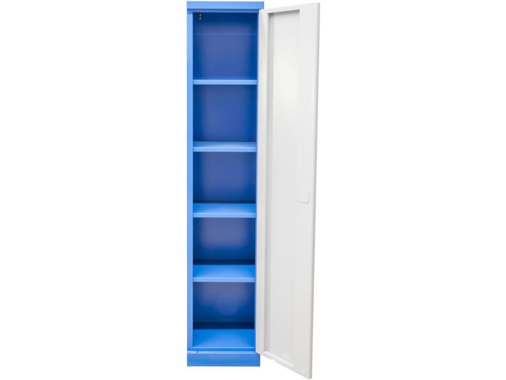 • Vybavení: úzká dveřová skříň s uzamykáním cylindrickým/rozvorovým zámkem (-> dvojité uzamčení, 2 klíče); čtyři vyjímatelné police (-> volitelné nastavení výšky, nosnost: 50 kg).
