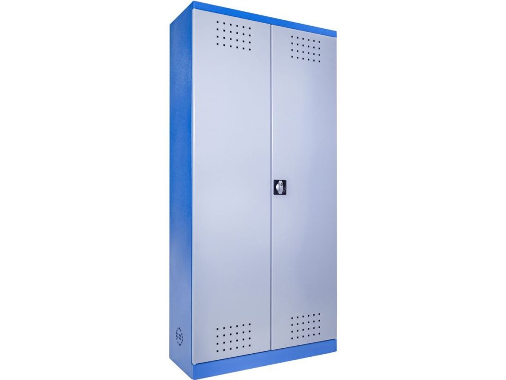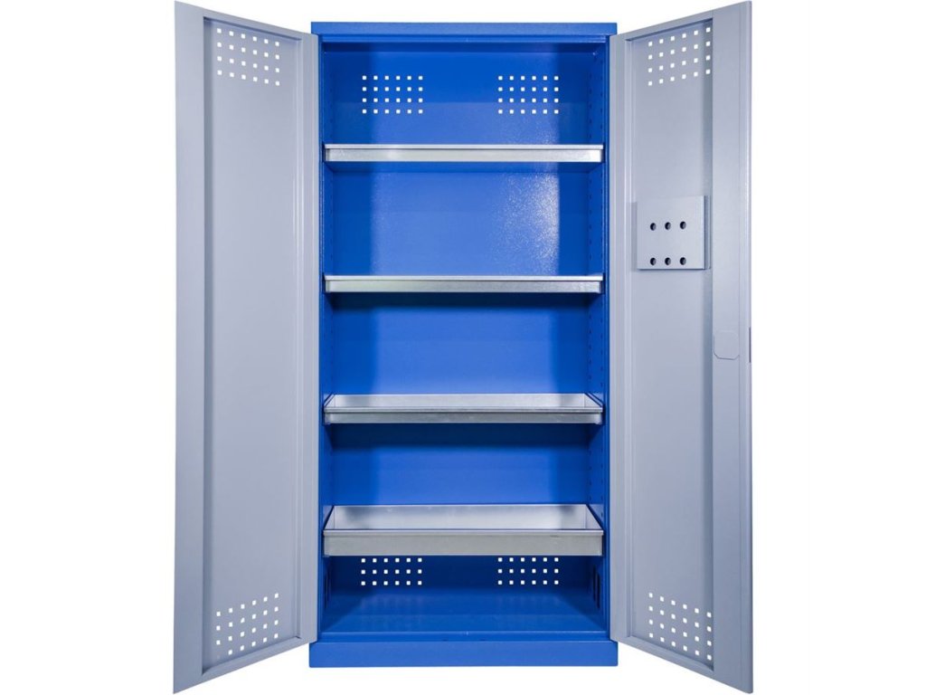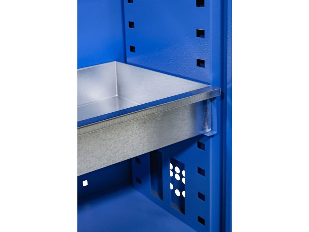 • Vybavení: dvoudveřová skříň (-> uzamykání cylindrickým/rozvorovým zámkem - dvojité uzamčení, 2 klíče); 4 výsuvné vany z pozinkovaného plechu (-> volitelné nastavení výšky, nosnost: 30 kg); systém odvětrávání skříně (-> děrovaný korpus/dveře). Konstrukce: ocelový rám se soklem (-> 1.920 x 920 x 380 mm, oblé hrany).