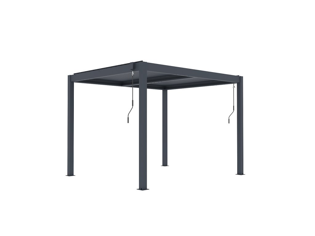 Volně stojící bioklimatická pergola LANITPLAST BIOCLIMATIC BASIC o rozměrech 3 x 2,5 metru je praktickým a elegantním řešením pro zastřešení venkovního posezení na Vaší zahradě. Robustní a stabilní konstrukce v moderním antracitovém odstínu RAL 7016 s matnou povrchovou úpravou se snadno začlení do jakéhokoliv prostředí a nevyžaduje kotvení do stěny. Sloupy i nosné profily jsou vyrobeny z hliníku a otočné lamely z kvalitní oceli, vše je opatřené vypalovaným práškovým lakem (komaxit). Střešní lamely z pozinkované oceli jsou rovněž opatřeny práškovou barvou, která zajišťuje vysokou odolnost vůči povětrnostním podmínkám. Celkem 32 otočných lamel poskytuje spolehlivou ochranu před slunečními paprsky i deštěm. Jejich sklon lze plynule nastavit od zcela uzavřené polohy (0°) až po plné otevření v úhlu 90°. Ovládání lamel je manuální a probíhá pomocí praktické kličky, která je konstruována tak, aby bylo možné ji naklonit a zabránit tak poškození povrchu pergoly při manipulaci. Její umístění navíc umožňuje bezproblémové používání dalších doplňků, jako jsou boční zástěny nebo moskytiéry, aniž by omezovala jejich funkčnost.