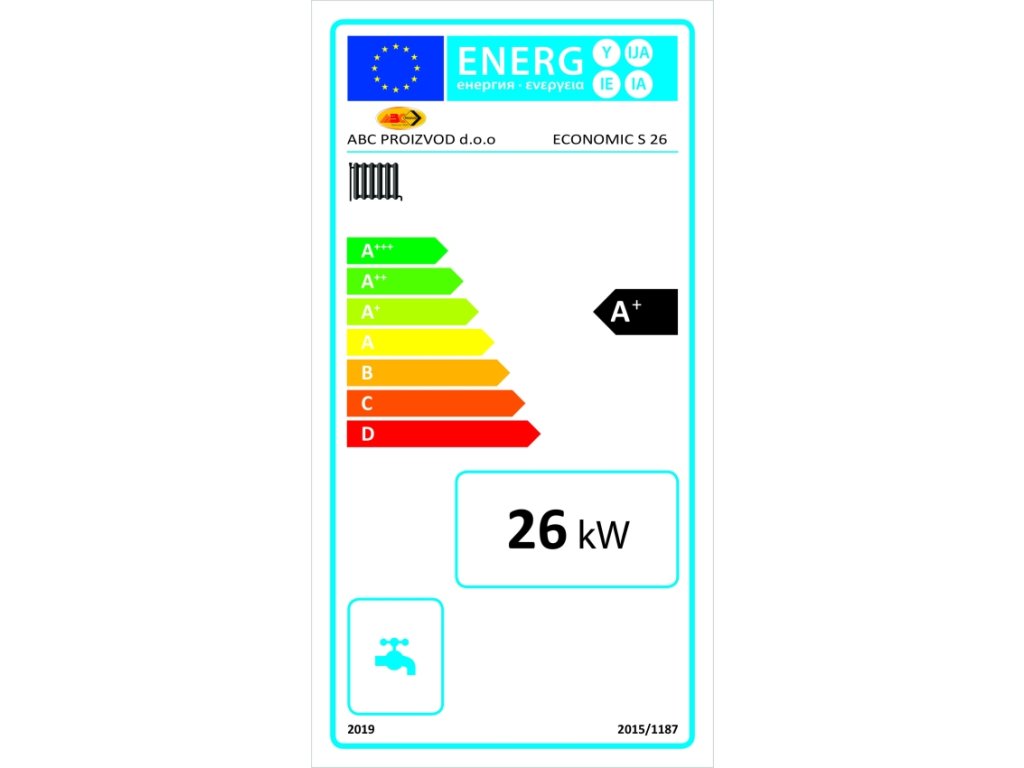 Ocelový kotel Economic s vysokou mírou úspory dostupný ve výkonu 26 kW, ve kterém je možné topit dřevem o délce polen cca 40 cm.