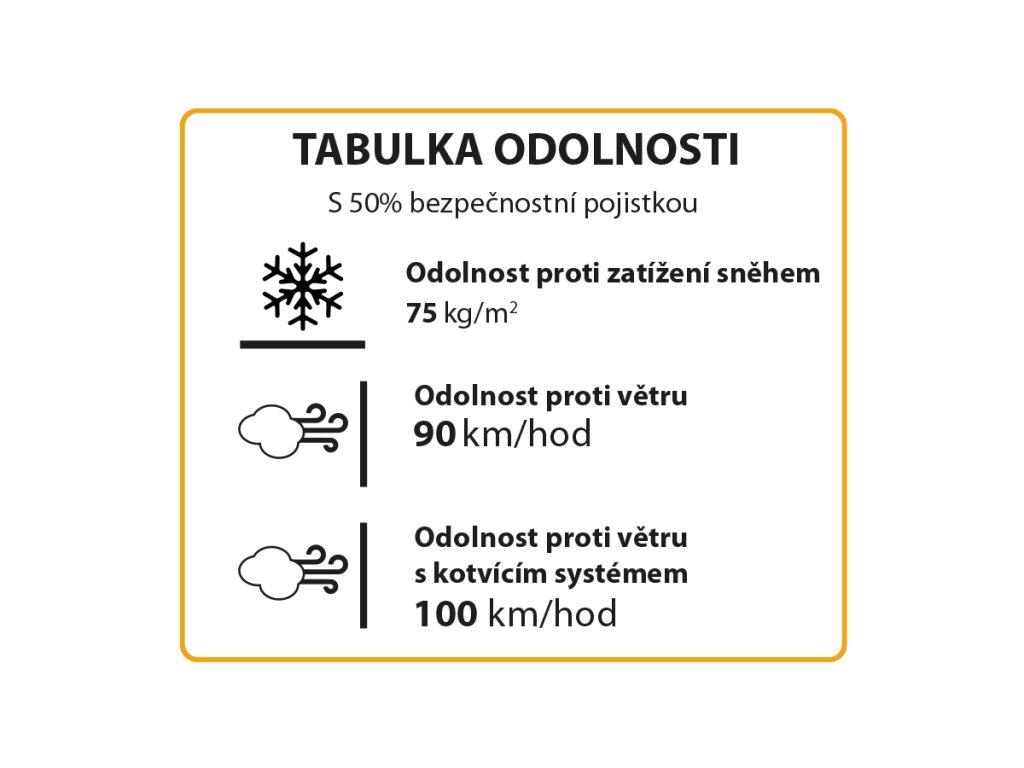 • Unikátní konstrukce ze silných hliníkových profilů odolným rzi - taková konstrukce si snadno poradí s větrem (je nutné pouze kvalitní připevnění k zemi) i s přívaly sněhu