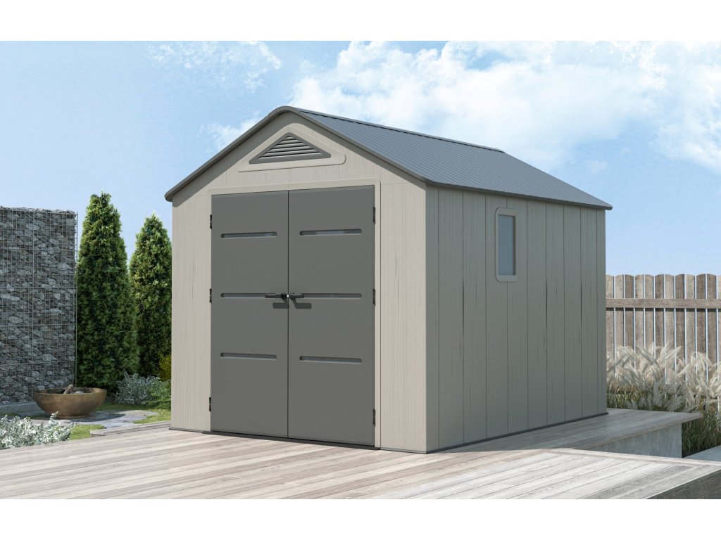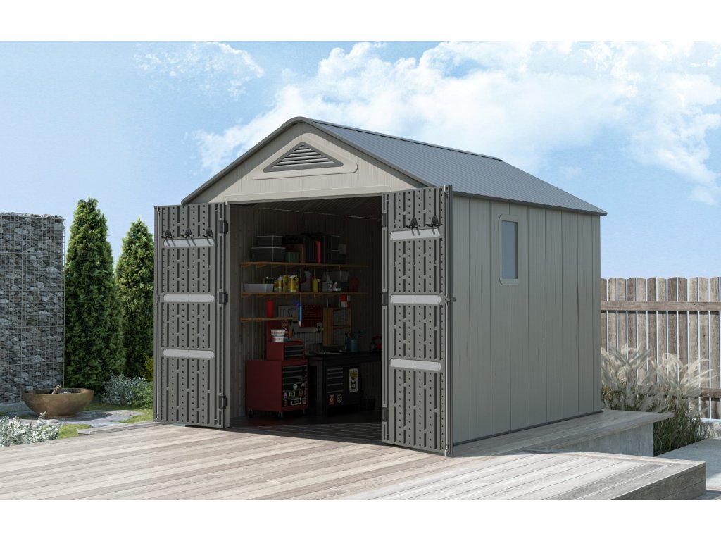 Robustní plastový domek "nové generace" k uskladnění zahrádkářských, sportovních, bazénových, grilovacích, campingových, motoristických a dalších potřeb. Moderní design, snadná montáž, celoroční použití. Zahradní domek má nosnou kovovou konstrukci a dvojité stěny, střecha, dvojité dveře, podlaha jsou vyrobeny z masivního velmi odolného a prakticky nerozbitného plastu (vysokopevnostní polyethylen s UV filtrem). Plastová protiskluzová podlaha je součástí domku (je v ceně). Domek je vybaven dvoukřídlými dveřmi na pantech. Síla dvojité plastové stěny je 22 mm, síla střechy je 36 mm. Sklon střechy je 30o, což výrazně snižuje množství a tlak sněhu na střechu. Materiál domku nežloutne ani nekřehne, takže odpadá pravidelné natírání domku jako je nutné v případě např. dřevěných domků - zahradní plastový domek je prakticky bezúdržbový. Domek je navržen a vyroben tak, aby montáž byla co nejjednodušší a nejkratší. Jednotlivé díly pouze zaklapnete do sousedních dílů a spoj zajistíte šroubkem.