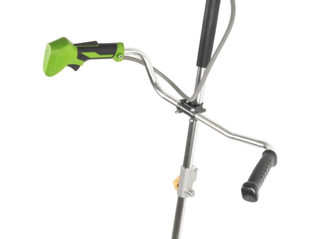 Obouruční rukojeť: Díky tomuto typu rukojeti se váha stroje rovnoměrně rozloží a umožňuje přirozenější, plynulý "sečící" pohyb, podobný práci s kosou. To vede k menší únavě rukou a zad i při delším sekání, přesnějšímu vedení stroje a vyšší efektivitě při úklidu větších ploch.