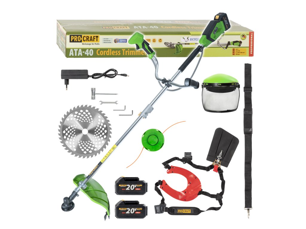 Procraft ATA-40C 2x20V SET - akumulátorový křovinořez (s 2x4,0 Ah akumulátory, nabíječkou, dvouramenným popruhem a ochranným štítem)