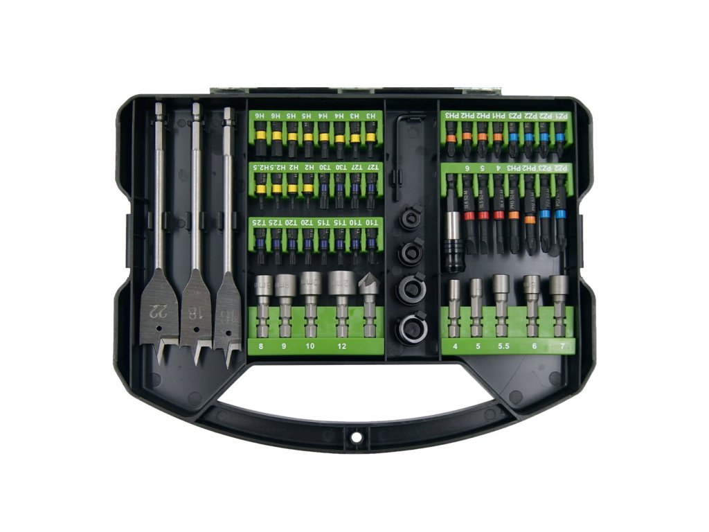 Kompletní výbava pro vrtání i šroubování: Obsahuje vrtáky do kovu (HSS), zdiva, dřeva i ploché vrtáky
