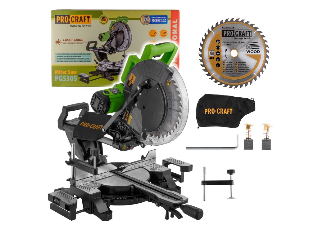 Pokosová pila s pojezdem Procraft PGS305 je určena k příčnému řezání dřeva, lišt z plastu. Silný motor s vysokými otáčkami až 3800 zaručuje vysoký řezný výkon. Možnost připojení vysavače přes hadici zaručí čisté pracovní prostředí. Upevnění k pracovnímu stolu pomocí otvorů zaručuji vysokou stabilitu při práci. Vybavena čárovým laserem integrovaným ve stroji, který usnadňuje kontrolu řezu a zaručuje vysokou přesnost. Součástí dodávky je kotouč, vak na prach, montážní klíč a uhlíkové kartáče. Balení karton. Nastavitelný úhel náklonu a úhel příčného řezu. Prodlužovací výsuvné stolky s dorazem.