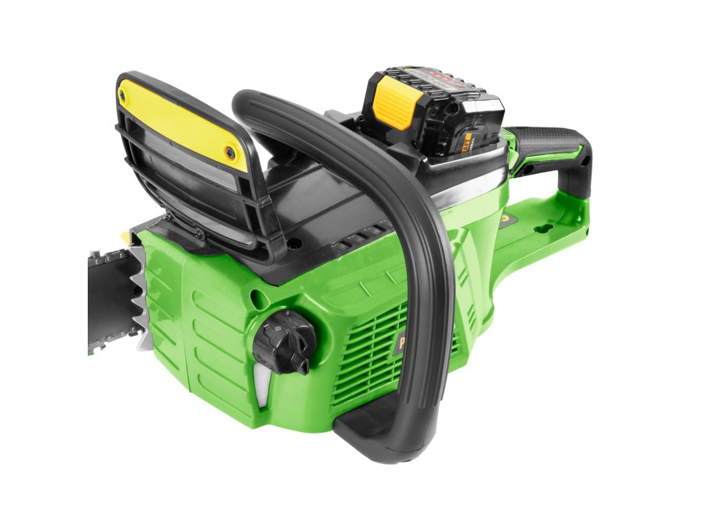 AKU řetězová pila je užitečným pomocníkem při zpracování palivového dřeva, menších tesařských pracech i prořezávání stromů. Její provoz je v porovnání s benzinovými stroji tichý. Je vybavena ochranou proti zpětnému rázu a bezpečnostní nárazovou brzdou pilového řetězu. Integrovaná nádržka na automatické mazání řetězu olejem. Stroj je dodávaný včetně vodící lišty a pilového řetězu v kartonu včetně 40V akumulátoru a nabíječky.