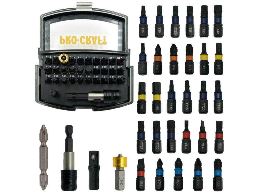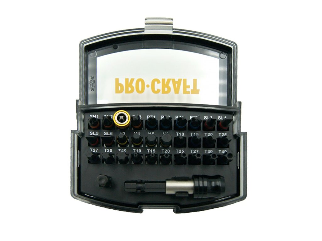 32dílná sada bitů Procraft BS-32 obsahuje široký výběr bitů pro různé aplikace.