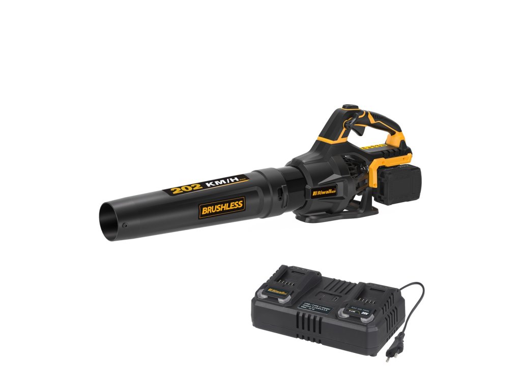 Součástí dodávky jsou dvě baterie o kapacitě 4 Ah a dvojitá rychlonabíječka (2 × 4,5 A), která zvládne nabít oba akumulátory přibližně za 60 minut. Doba provozu foukače s dodávanými bateriemi je cca 20 minut, v závislosti na zatížení. Baterie lze navíc kombinovat s dalšími stroji z programu Riwall PRO 20 V, což zvyšuje jejich univerzální využití. Na baterie se vztahuje 2 letá plná záruka, přičemž v případě problému jsou automaticky vyměněny za nové.