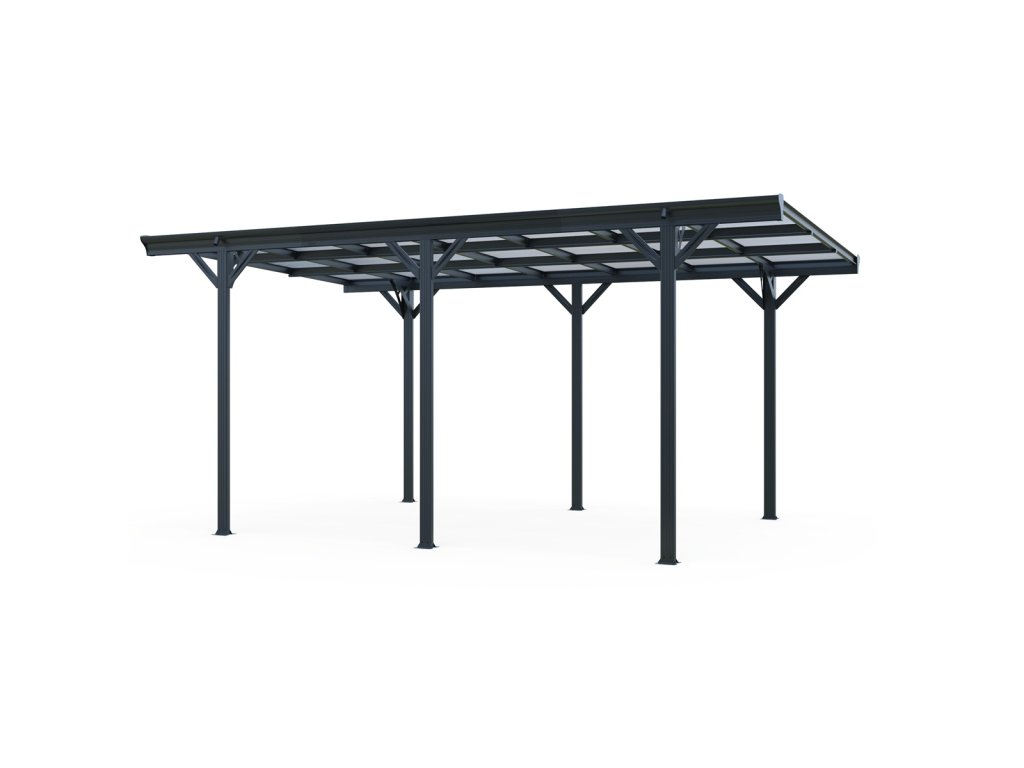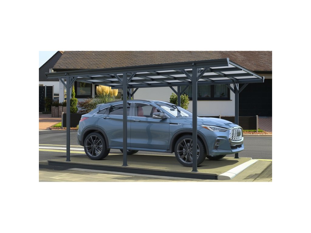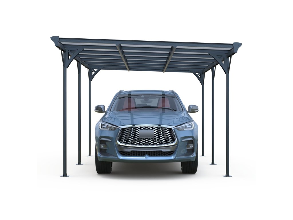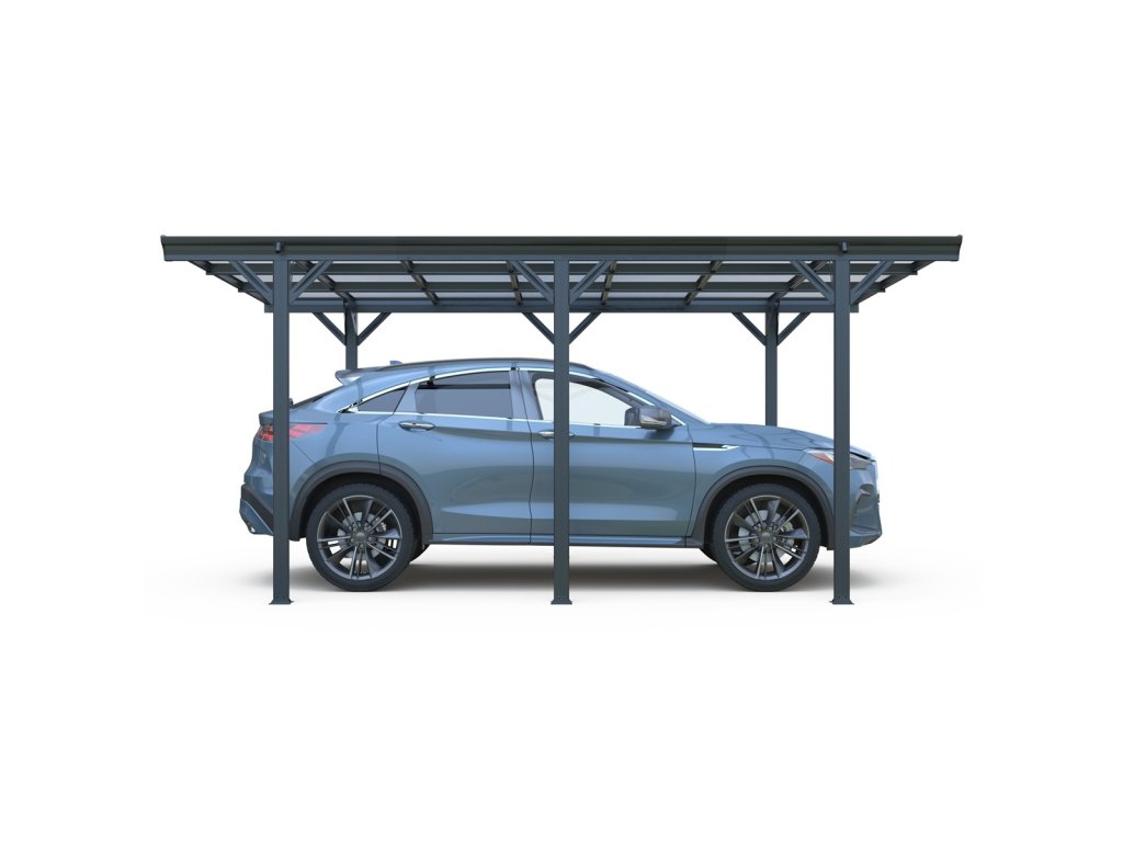 Moderní montovaný přístřešek pro auto RMCP 16 x 10 v elegantní antracitové barvě (RAL 7016) poskytuje stylovou a odolnou ochranu vašeho vozidla před deštěm, sněhem i slunečním zářením. Díky volně stojící konstrukci se skvěle hodí nejen k domům, ale i do volného prostoru, například na příjezdovou cestu či do zahrady. Přístřešek má celkové rozměry 503 × 305 × 232 cm, takže poskytuje dostatek prostoru pro pohodlné parkování běžného osobního vozu.