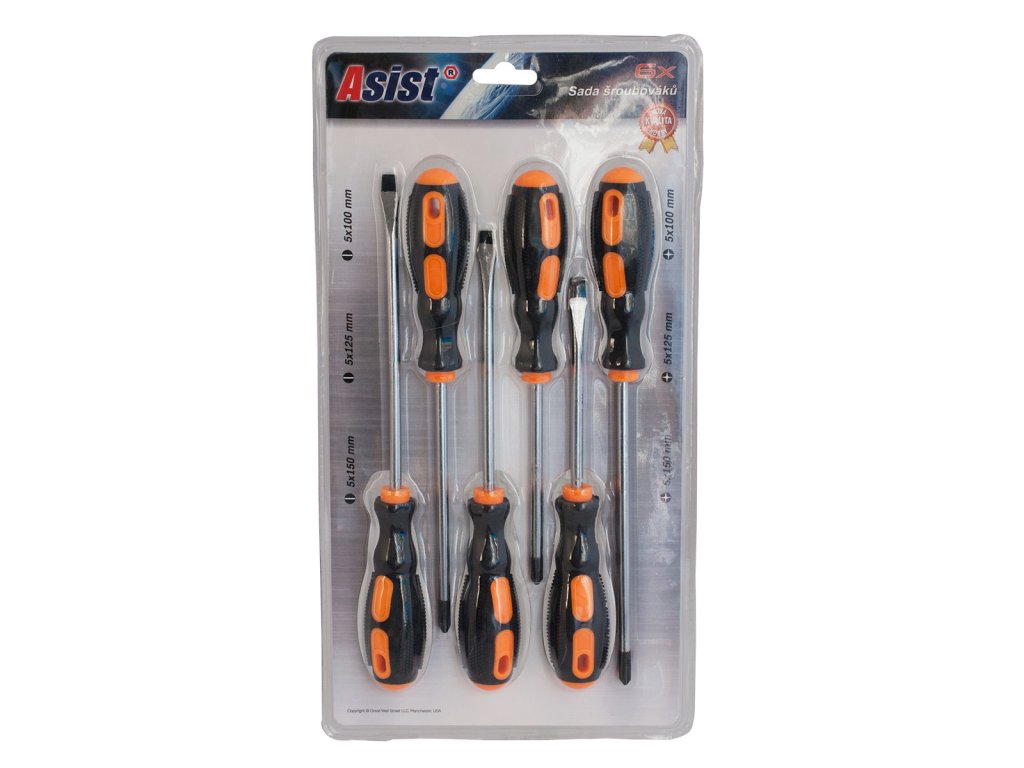 Sada šroubováků, 6 ks ASIST 33-1004 je univerzální výbava do každé domácnosti i dílny. Kombinace plochých a křížových šroubováků ve třech délkách pokryje nejčastější úkony od montáže nábytku přes hobby projekty až po drobné opravy spotřebičů. Precizně tvarované hroty zajišťují jistý záběr, pohodlné rukojeti zase komfort i při delší práci.