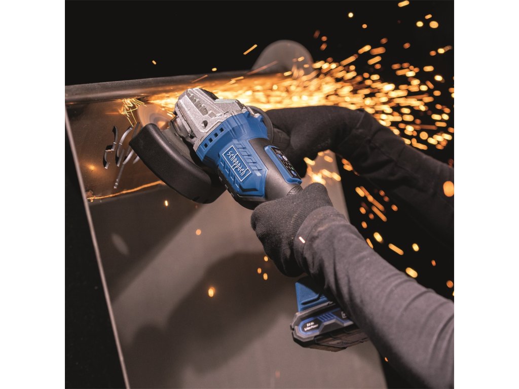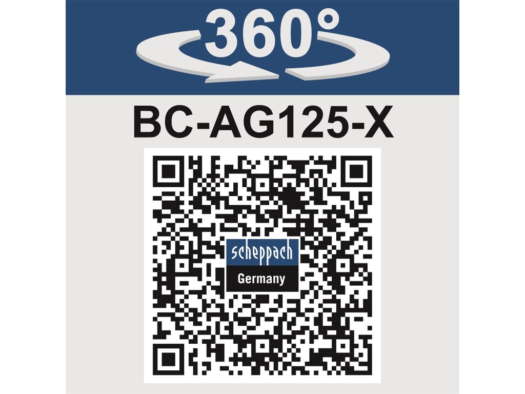 BC-AG125-X - 20 V aku úhlová bruska s bezuhlíkovým motoremTato výkonná aku úhlová bruska Scheppach BC-AG125-X je skvělým pomocníkem pro řezání, broušení i leštění. Její štíhlé tělo s hliníkovou přední částí a měkkými zónami úchopu umožňuje snadnou práci i v úzkých prostorách. Bezpečnost při práci zvyšuje ochranný kryt, který lze snadno nastavit bez použití nářadí.