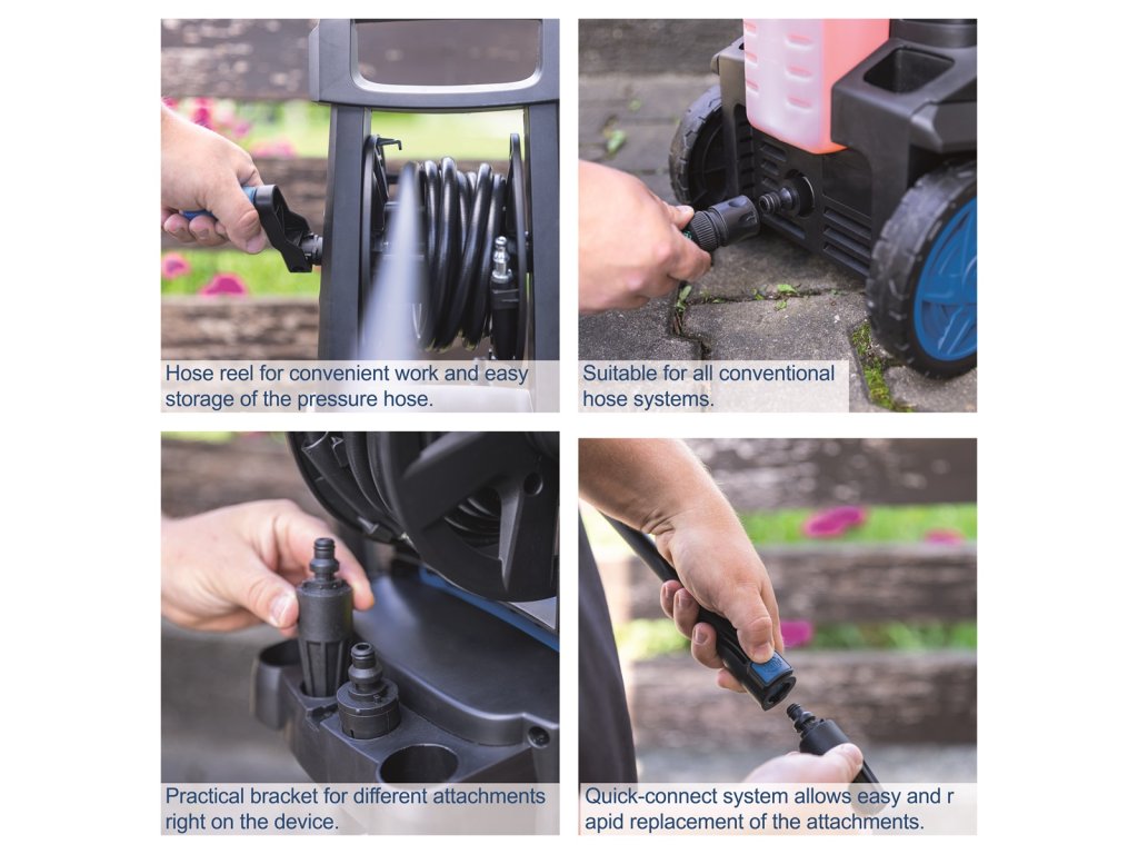 Myčka je vybavena silným motorem o výkonu 2400 W, který umožňuje čerpadlu dosáhnout maximálního tlaku 180 barů, což je důležité pro těžké úklidové práce. Pro snadnou obsluhu jsou připojovací prvky a hadice vybaveny rychlospojkami. Základní příslušenství, jako tlaková pistole a elektrický kabel, se dají při skladování pohodlně umístit přímo v držácích na myčce, tlaková hadice je navinutá na otočném bubnu. Myčka je vybavena čerpadlem se samonasávací funkcí. Stroj lze buď připojit ke kohoutku s tlakovou vodou, nebo si dokáže sám nasávat vodu z kbelíku, sudu nebo jiné nádrže. Nejste tak při mytí omezeni dostupností vody z běžného vodovodního řádu. Stroj je rovněž vybaven systémem Auto stop, kdy se při uvolnění spínače na tlakové pistoli rovněž vypíná motor. Pro snadnou manipulaci a transport je myčka vybavena madlem a dvěma velkými koly.