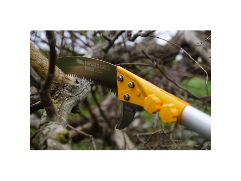 Hayate 5000-6,5 - teleskopická pilaSkutečná heavy duty pila určená speciálně pro profesionály. Hayate má velmi robustní konstrukci, což z ní činí nejodolnější pilu z celé řady teleskopických pil Silky. Čepel má unikátní zuby Mirai-Me od Silky a na začátku a konci čepele dvě velká srpovitá ostří. Horní zakřivení udržuje čepel ve střihu, zatímco spodní ostří usnadňuje podřezávání kůry. Dolní ostří lze v případě potřeby demontovat.