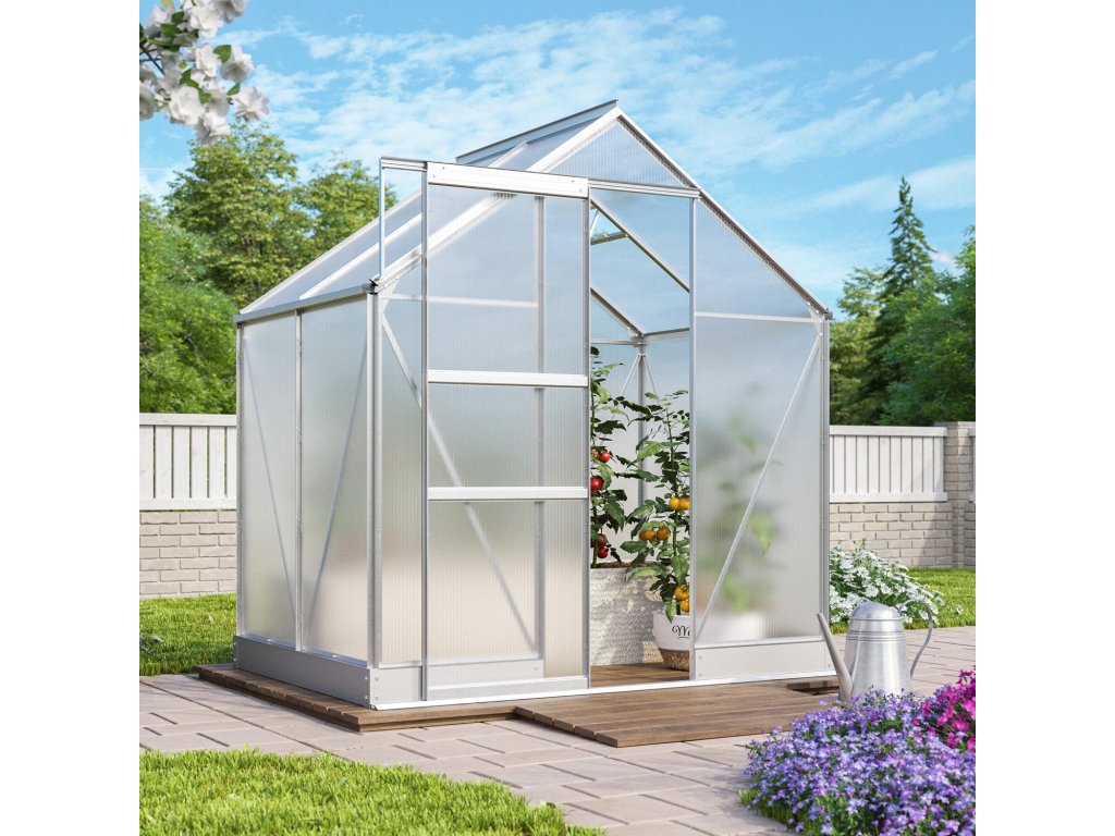 Obsahem balení jsou jednokřídlé posuvné dveře (š x v otvoru = 0,61 x 1,74 m), AL profily, prosklení, pozinkovaná ocelová základna, 1x střešní ventilační okénko s manuálním otevíráním, veškerý spojovací materiál. Ke skleníku je možné dokoupit řadu nadstandardního příslušenství - poličky, regály, další větrací střešní okno, automatický otvírač, okapové sady, teploměry, vlhkoměry, zavlažovací zařízení, elektrické odporové vytápění půdy.