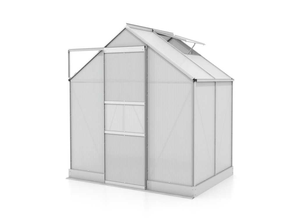 Obsahem balení jsou jednokřídlé posuvné dveře (š x v otvoru = 0,61 x 1,74 m), AL profily, prosklení, pozinkovaná ocelová základna, 1x střešní ventilační okénko s manuálním otevíráním, veškerý spojovací materiál. Ke skleníku je možné dokoupit řadu nadstandardního příslušenství - poličky, regály, další větrací střešní okno, automatický otvírač, okapové sady, teploměry, vlhkoměry, zavlažovací zařízení, elektrické odporové vytápění půdy.