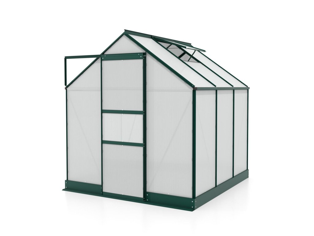 Obsahem balení jsou jednokřídlé posuvné dveře (š x v otvoru = 0,61 x 1,74 m), AL profily, prosklení, pozinkovaná ocelová základna, 1x střešní ventilační okénko s manuálním otevíráním, veškerý spojovací materiál. Ke skleníku je možné dokoupit řadu nadstandardního příslušenství - poličky, regály, další větrací střešní okno, automatický otvírač, okapové sady, teploměry, vlhkoměry, zavlažovací zařízení, elektrické odporové vytápění půdy.
