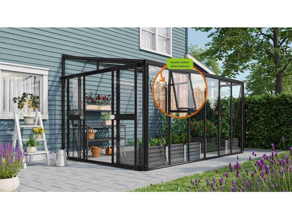 Obsahem balení jsou dvoukřídlé posuvné dveře (š x v otvoru = 1,19 x 1,77 m), AL profily, prosklení, 2x boční ventilační okénko s manuálním otevíráním, 1x okapový žlab včetně dvou svodů, 1x cylindrický zámek a veškerý spojovací materiál. Ke skleníku je možné dokoupit řadu nadstandardního příslušenství - poličky, regály, další větrací střešní i boční okénka, automatické otvírače k těmto okénkům, teploměry, vlhkoměry, zavlažovací zařízení, elektrické odporové vytápění půdy. Baleno v papírovém kartonu. Prosklení je zabalené v nevratné dřevěné bedně.