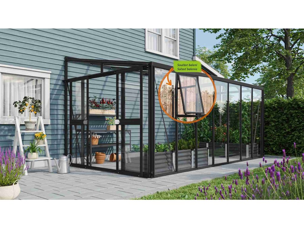 Obsahem balení jsou dvoukřídlé posuvné dveře (š x v otvoru = 1,19 x 1,77 m), AL profily, prosklení, 3x boční ventilační okénko s manuálním otevíráním, 1x okapový žlab včetně dvou svodů, 1x cylindrický zámek a veškerý spojovací materiál. Ke skleníku je možné dokoupit řadu nadstandardního příslušenství - poličky, regály, další větrací střešní i boční okénka, automatické otvírače k těmto okénkům, teploměry, vlhkoměry, zavlažovací zařízení, elektrické odporové vytápění půdy. Baleno v papírovém kartonu. Prosklení je zabalené v nevratné dřevěné bedně.
