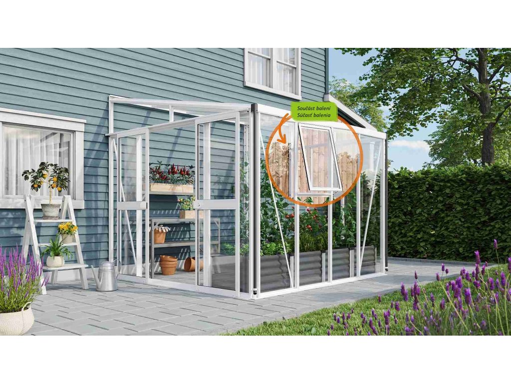 Obsahem balení jsou dvoukřídlé posuvné dveře (š x v otvoru = 1,19 x 1,77 m), AL profily, prosklení, 1x boční ventilační okénko s manuálním otevíráním, 1x okapový žlab včetně dvou svodů, 1x cylindrický zámek a veškerý spojovací materiál. Ke skleníku je možné dokoupit řadu nadstandardního příslušenství - poličky, regály, další větrací střešní i boční okénka, automatické otvírače k těmto okénkům, teploměry, vlhkoměry, zavlažovací zařízení, elektrické odporové vytápění půdy. Baleno v papírovém kartonu. Prosklení je zabalené v nevratné dřevěné bedně.