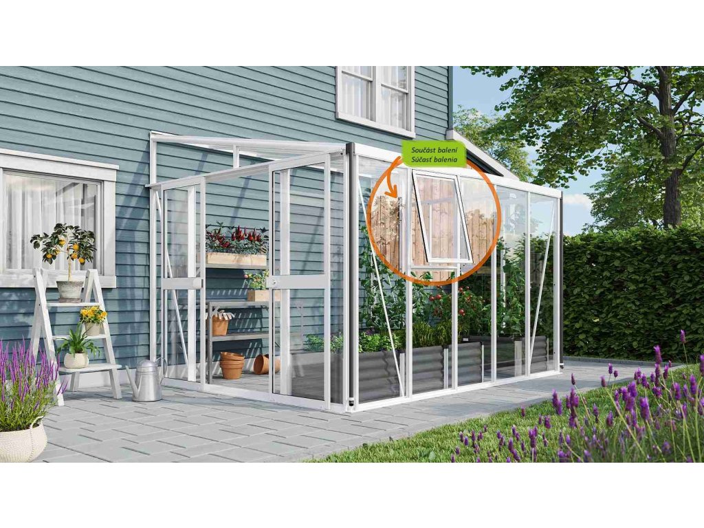 Obsahem balení jsou dvoukřídlé posuvné dveře (š x v otvoru = 1,19 x 1,77 m), AL profily, prosklení, 2x boční ventilační okénko s manuálním otevíráním, 1x okapový žlab včetně dvou svodů, 1x cylindrický zámek a veškerý spojovací materiál. Ke skleníku je možné dokoupit řadu nadstandardního příslušenství - poličky, regály, další větrací střešní i boční okénka, automatické otvírače k těmto okénkům, teploměry, vlhkoměry, zavlažovací zařízení, elektrické odporové vytápění půdy. Baleno v papírovém kartonu. Prosklení je zabalené v nevratné dřevěné bedně.