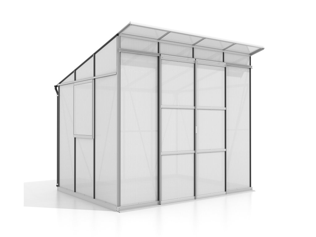 Obsahem balení jsou dvoukřídlé posuvné dveře (š x v otvoru = 1,22 x 1,92 m), AL profily, prosklení, 1x boční ventilační okénko s manuálním otevíráním, 1x okapový žlab včetně dvou svodů, veškerý spojovací materiál. Ke skleníku je možné dokoupit řadu nadstandardního příslušenství - poličky, regály, další větrací střešní i boční okénka, automatické otvírače k těmto okénkům, okapové sady, teploměry, vlhkoměry, zavlažovací zařízení, elektrické odporové vytápění půdy.