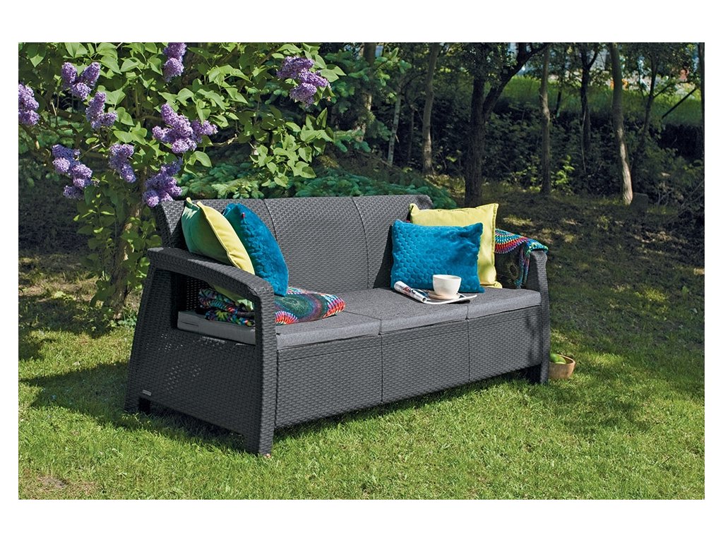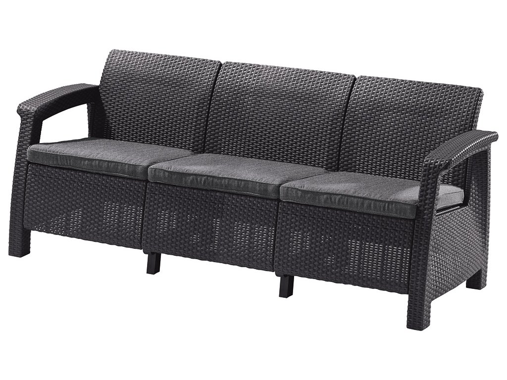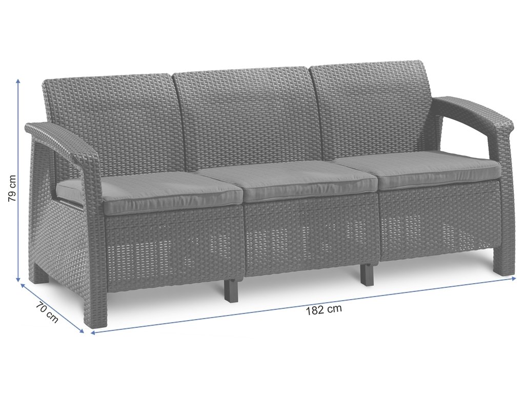 Moderní třímístná pohovka Corfu Love Seat Max je univerzálním vybavením pro zahradu, velký balkón nebo terasu. Je vyroben z polypropylenu, který je velmi odolný vůči povětrnostním vlivům a nevyžaduje žádnou údržbu. Pohovku lze umýt vodou a jemnými čisticími prostředky. Sedadla mají pohodlné polštáře, jejichž povlaky se díky zipu dají jednoduše sundat. Pohovka je navržena tak, aby ji snadno sestavil opravdu každý.