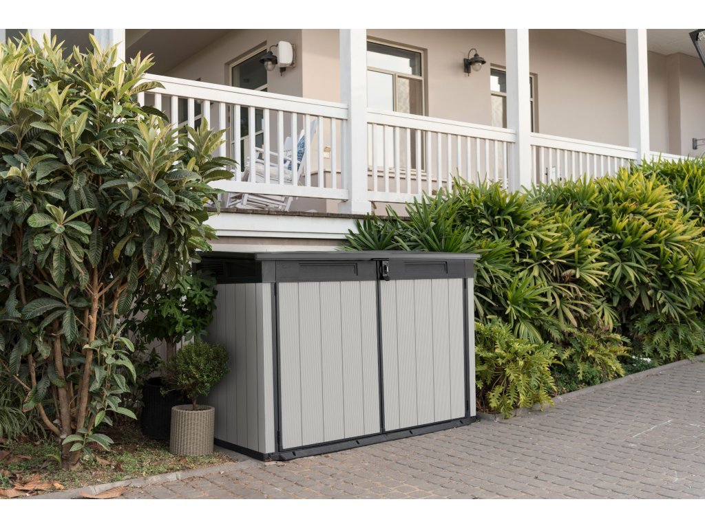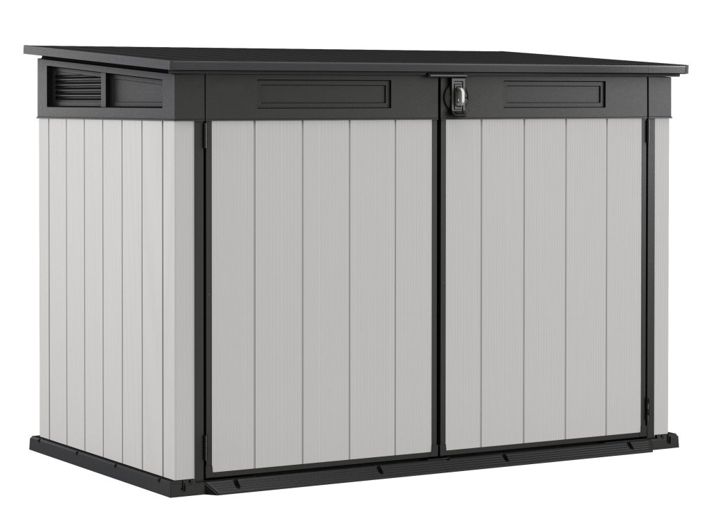 Premier Jumbo s kapacitou 2020 L je dostatečně široká a vysoká úložná skříň, která pojme cokoli od kol, zahradního vybavení po venkovní nábytek. Úložný box hravě schová i dvě 360L nebo dokonce tři 240L popelnice, které dovnitř dostanete velmi snadno díky zešikmenému prahu.